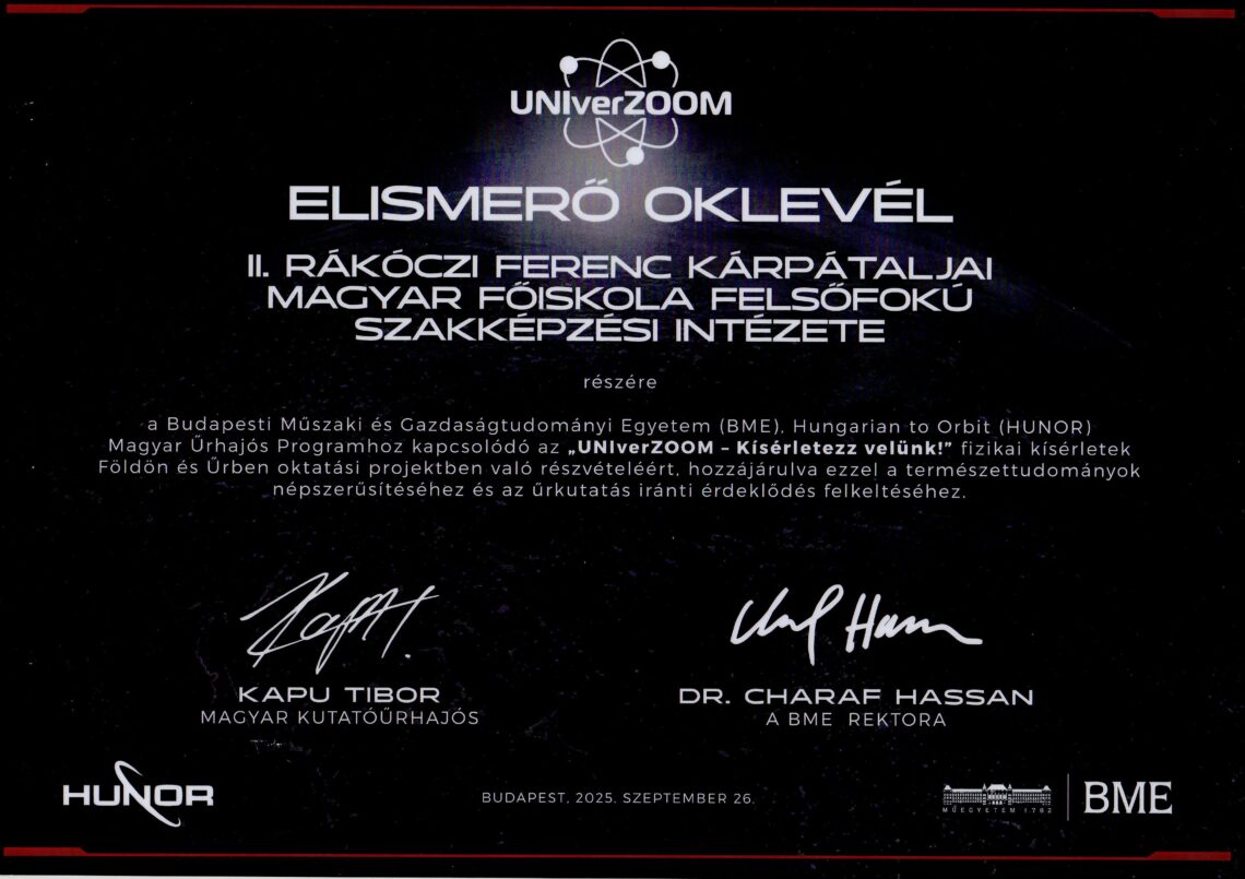 Ahol a súlytalanság felülírja a gravitációt.” A II. Rákóczi Ferenc Kárpátalja Magyar Egyetem Felsőfokú Szakképzési Intézete sikeresen pályázott az „UNIverZOOM– Kísérletezz velünk!” fizikai kísérletek Földön és Űrben című oktatási programra. A program célja az volt, hogy a diákok testközelből tapasztalhassák meg az űrkutatás izgalmát, és megértsék az űrbéli kísérletek jelentőségét a földi életre vonatkozóan. Nagy lelkesedéssel készültünk már az előző tanév végén, de a felbocsátás halasztása és technikai okok miatt ez csak 2025.december 02-án valósulhatott meg. A II. évfolyamos alkalmazott matematika szakos diákok ennek ellenére izgatottan várták, hogy megismerjék mit rejt a kísérleti eszközöket tartalmazó doboz! Hét kísérletet végeztek el a diákok Makó Pál fizika tanárral együtt a fizika teremben,…