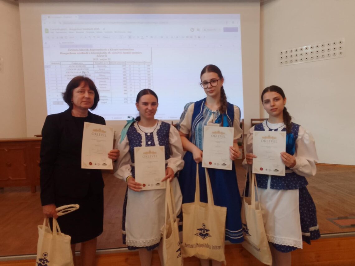 Змістовну розповідь про відомого в Закарпатті мукачівського скульптора Матл Петера, збагачену  декламуванням поезій та співом дівчат, високими балами було оцінено членами компетентного журі. Наступного дня  у фіналі конкурсу  «Hungaricum», окрім виконання тестових завдань, учасники змагання мали представити національний продукт або постать серед угорців, достойних  високої честі бути віднесеними до переліку національних цінностей. Наша команда презентувала традиційне в регіоні виноробство — виготовлення бочок для зберігання вина та діяльність виноробів сім’ї Полін у селі Шаланки на Виноградівщині й сім’ї Параска у селі Бене на Берегівщині. У фіналі команда дівчат, посівши 9-те місце, потрапила до десятки найкращих.